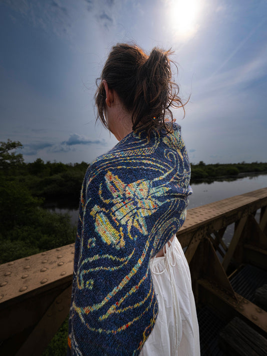 This design balances graphic structure with delicate softness, echoing the worn beauty of oxidized metal and faded textiles.The motif unfolds gently across the fabric like fractured lace, inviting the knitter into a meditative rhythm of construction and grace.
