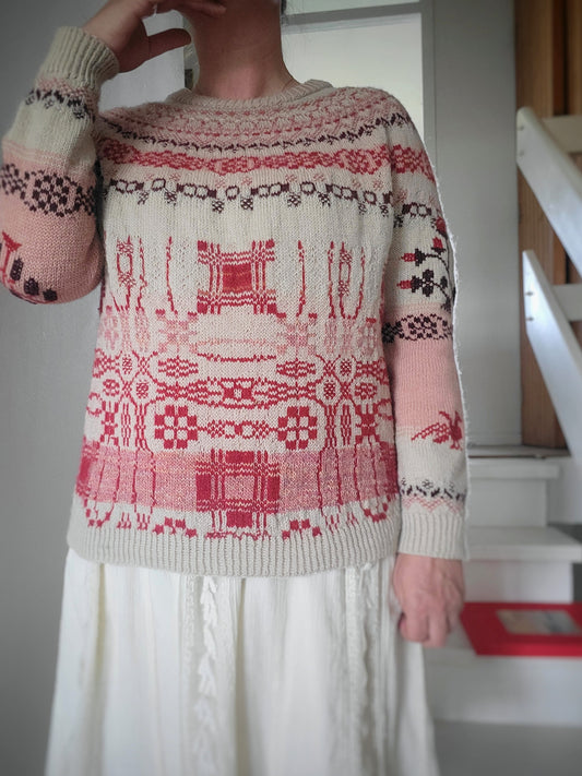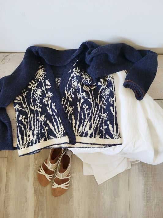 This design balances graphic structure with delicate softness, echoing the worn beauty of oxidized metal and faded textiles.The motif unfolds gently across the fabric like fractured lace, inviting the knitter into a meditative rhythm of construction and grace.
