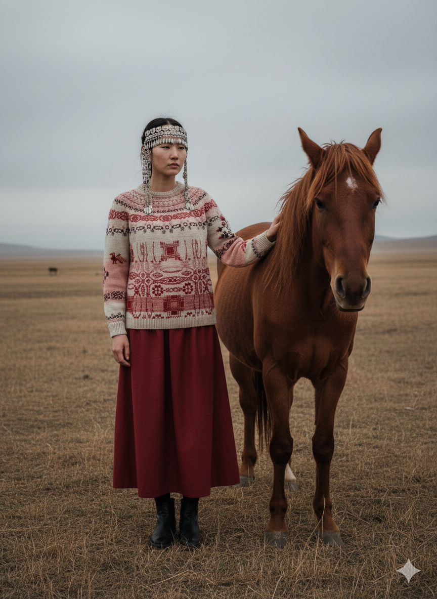 This design balances graphic structure with delicate softness, echoing the worn beauty of oxidized metal and faded textiles.The motif unfolds gently across the fabric like fractured lace, inviting the knitter into a meditative rhythm of construction and grace.