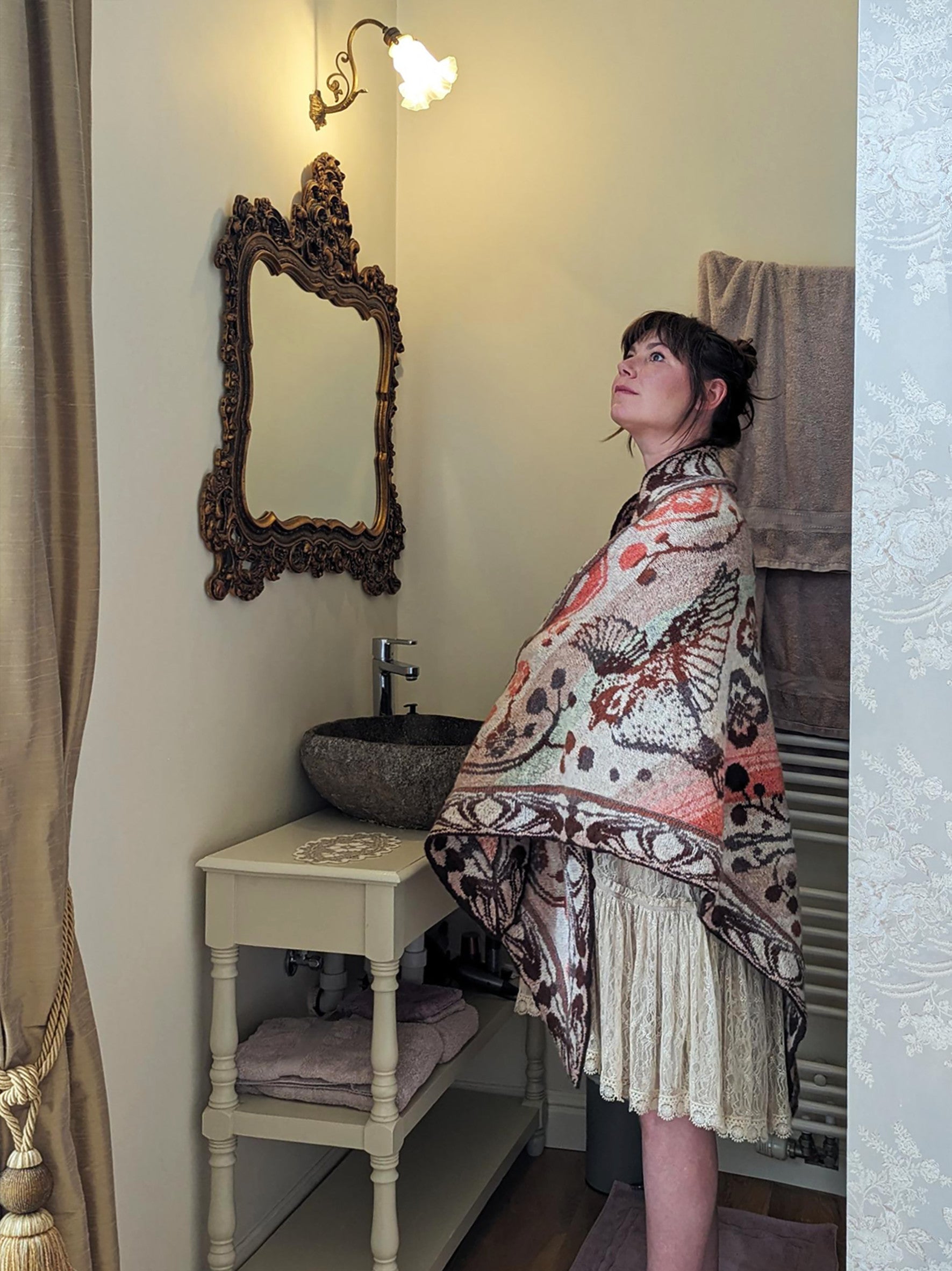 Ungefähre Maße des Schals: 200 cm x 150 cm mit einer Maschenprobe von 25 x 26 Maschen, gestrickt auf 3,25 mm Nadeln.