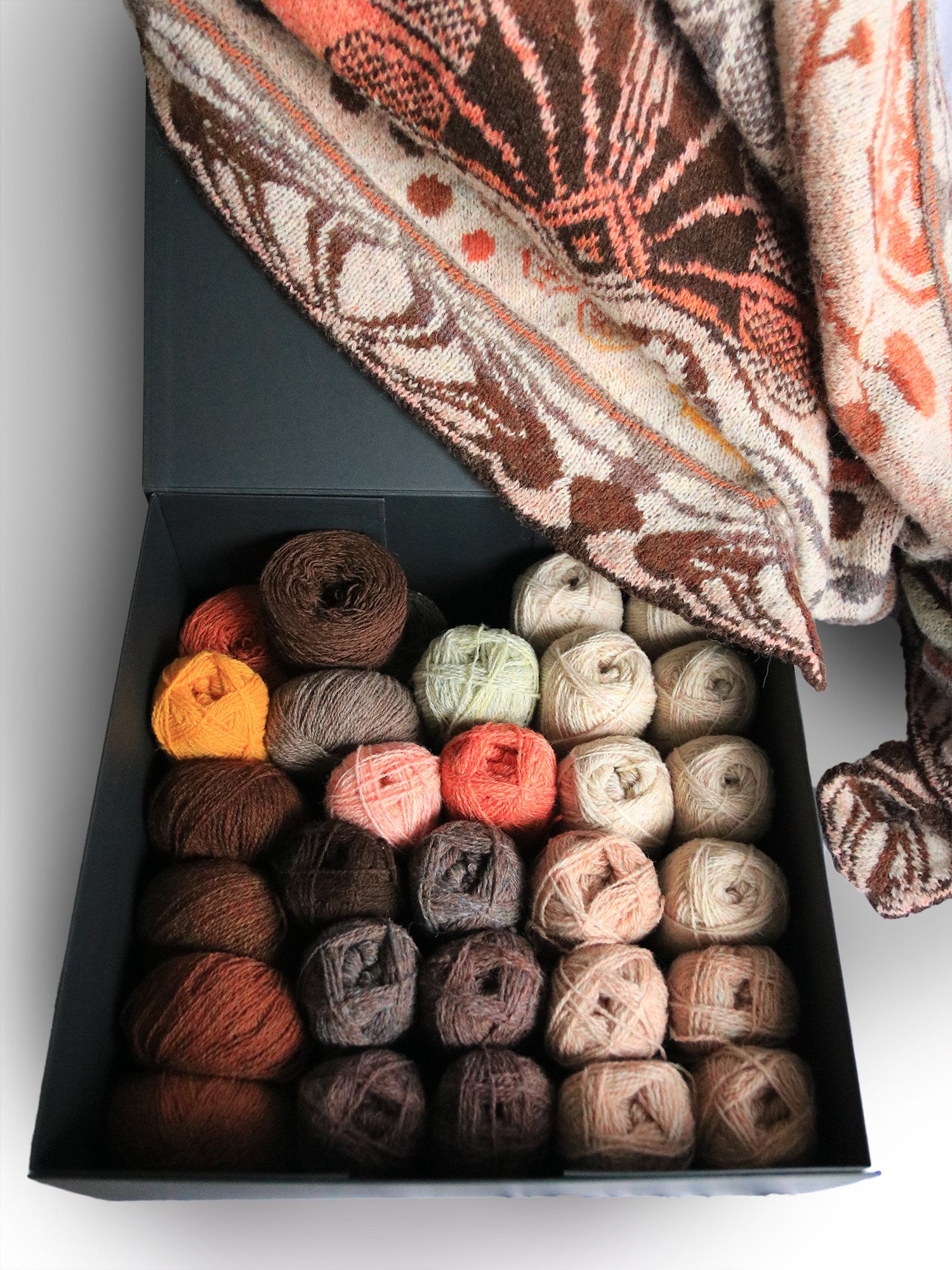 - All the original colors of the yarns you will need for this project. It is Shetland wool, which is ideal for two-color knitting.